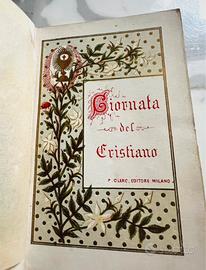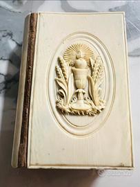 Bellissimo e antico libro tascabile, di preghiera, con rivestimento in avorio (o bachelite?) con favoloso intarsio sul fronte. Anno di stampa 1878.