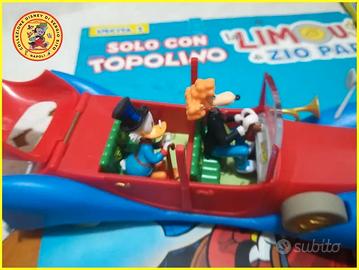 Un affarone per veri collezionisti: le due uscite in edicola di Topolino n° 3639 e 3640 e l'intera Limousine di Zio Paperone, contenente i due personaggi, compreso l'autista Battista e nel cofano ci sono due sacchetti di monete e una paletta per raccogliere gli spiccioli esistenti nel cofano. In più ho aggiunto un introvabile fermabanconote che era allegato a un Topolino Vintage con l'immagine di Archimede. Ho aperto le due blisterature solo per leggere di due fumetti, i prodotti sono da edicola, Allego anche il cartoncino della seconda uscita.