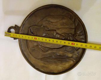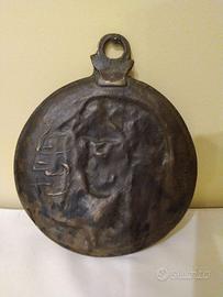 Si tratta di un oggetto vintage da collezione, un medaglione circolare in bronzo ossidato, con un'ansa per appenderlo.