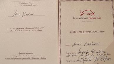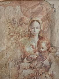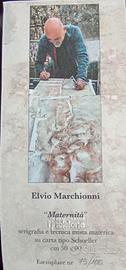 Titolo dell'opera: "La Maternità", serigrafia polimaterica su carta speciale. Dimensione cm. 50x90. Edizione limitata, esemplare n. 75/100. Autore Elvio Marchionni . nato a Spello nel 1944. Numerose le mostre, rassegne dove espone i suoi lavori, in particolare a Parigi, Madrid, California, Germania, Assisi, Roma, Bologna, Su invito di Vittorio Sgarbi espone alla 54^ edizione della Biennale di Venezia. Su commissione del Vaticano esegue il ritratto di papa Francesco. Le sue opere appaiono come frammenti di pittura murale, strappi di "affreschi e di memorie filtrati e consumati dal tempo"