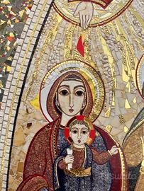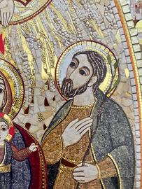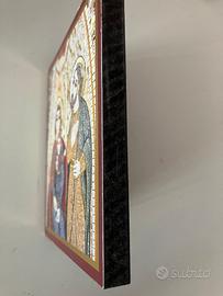 Quadretto raffigurante la Sacra Famiglia: Maria, Gesu' e san Giuseppe su cui discende lo Spirito Santo.