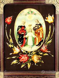 Sul fondo, sono inseriti vari inserti in foglia d'oro zecchino per evidenziare e decorare le vesti della Madonna, San Giuseppe e i fiori che stanno alla base e ai lati. Questi sono dipinti a mano sull'altra superfice interna del vetro, a formare un effetto veramente speciale e raro.
