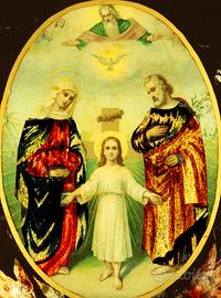 Vecchia e preziosa stampa a colori su cartoncino che rappresenta la Sacra Famiglia con lo Spirito Santo e gli Angeli.