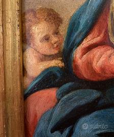 Un piccolo angelo si trova alle spalle di Maria, un elemento decorativo classico per sottolineare la natura divina della scena. Uno scorcio di paesaggio sulla destra dona prospettiva.