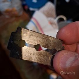 Lametta originale tedesca ROTBART “Be-Be”, produzione anni ’30–’40. Marchio e incisioni ancora leggibili (“Be-Be”, “Made in Germany”, “Under German Patent”). Segni del tempo e ossidazione compatibili con l’età. Proviene da un kit da lavoro d'epoca appartenuto a un pittore. Includo anche la bustina originale Gillette trovata insieme (non la sua). Pezzo raro e ricercato da collezionisti di rasatura tradizionale e oggetti vintage.