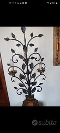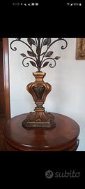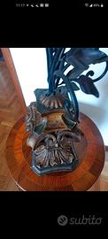 Bellissima lampada da tavolo in stile toscano antico. La struttura è realizzata in ferro battuto con dettagli decorativi a foglia, mentre la base è in legno lavorato con finiture color oro e verde. Ideale per arredare con gusto la tua casa. -Perfetta per un ambiente classico o rustico. -Base in legno finemente lavorato. -Struttura in ferro battuto elegante e resistente. -3 luci funzionanti con attacco piccolo.