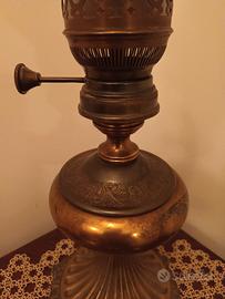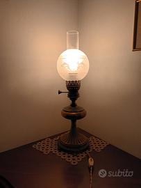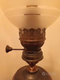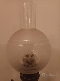 Elegante lampada a petrolio originale della prima metà del Novecento, successivamente convertita all’alimentazione elettrica. Corpo in ottone brunito inciso con motivi floreali, base decorata in fusione metallica e diffusore in vetro satinato inciso con camino in vetro trasparente.