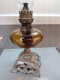 Elegante e imponente lampada a petrolio antica, un perfetto esempio di artigianato d'epoca che fonde lo stile Neoclassico con la funzionalità industriale del XIX secolo. Caratterizzata da una base scultorea e un corpo in vetro dai toni caldi, è un pezzo da esposizione unico.