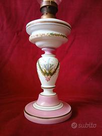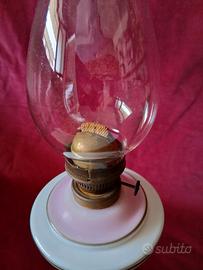 Realizzata in porcellana con decorazioni dipinte a mano. Bruciatore H S. Vetro Cristal Patent 11` con scritte in arabo. Pezzo da esportazione per il mercato mediorientale/ottomano. Bruciatore originale tedesco. Vetro in cristallo brevettato. Dimensioni: H 55, L (diametro) 14. Perfettamente conservato, la rotella del bruciatore funziona correttamente.