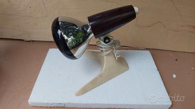 Lampada “sun lamp” da tavolo anni ’60 circa. Parabola con vetro filtro scuro, corpo in plastica tipo bachelite, snodo orientabile e base stabile a tre piedi. Cavo e interruttore d’epoca. Oggetto da modernariato/collezione o scenografia.