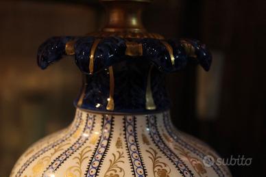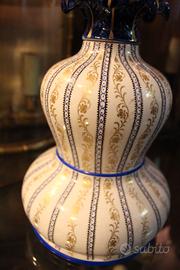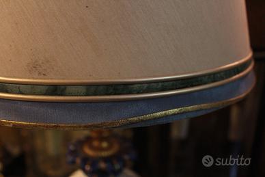 Lampada da tavolo in porcellana dipinta a mano, anni ’60. Linee morbide e decorazione sobria ed elegante, tipica della produzione del periodo. Il paralume è originale e presenta alcune macchie, come evidenziato nelle foto, ma l’oggetto conserva un notevole valore decorativo e collezionistico. Ideale come luce da comodino o punto luce raffinato in ambienti classici e vintage.