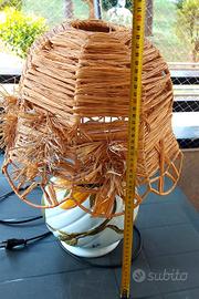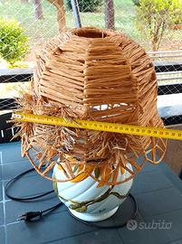Lampada Artigianale con Paralume in Paglia Intrecciata E Ceramica Anni 60/70 realizzata con materiali naturali e lavorata a mano. Il paralume è intrecciato con cura utilizzando paglia naturale, creando un affascinante effetto di luce e ombre che si proiettano sulla parete quando la lampada è accesa.
