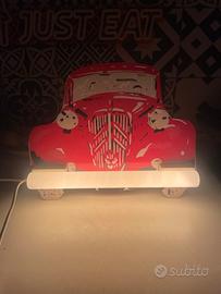 Particolare lampada vintage in plexiglas a forma di muso automobile Citroen con lampadina lunga frontale.