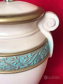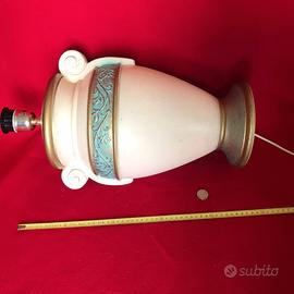 Grande lampada degli anni 90 marchio Les Arts Studio. base in ceramica da appoggio senza cappello, il vaso cavo è in stile classico con due volute laterali fondo color avorio e fascia circolare in rilievo con decorazioni floreali di color acqua marina con filature dorate, completa e funzionante in tutta la parte elettrica. Misure generali: altezza base al porta lampada cm.51 base cm. 18 larghezza cm. 28. Il manufatto è sano in buono stato con piccoli segni del tempo come da foto.