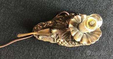 Bellissima lampada da comodino/scrivania anni 50 in ottone con patina del tempo (vedi foto) con uccellino che osserva la luce adagiata su una foglia, oggetto per collezionisti del genere e commercianti di antiquariato funziona a 220 volt si consiglia una lampadina a led a luce calda NO a filamento se no si scalda troppo il porta lampada.....peso 800 grammi presa originale in bachelite misura h. 15 cm. Larg. 20 cm. Profondità 9 cm. Visto è piaciuto non riprendo indietro spedizione tracciata a carico vostro pagamento con PayPal spese di commissione a carico vostro o bonifico b. Ritiro a mano a Parabiago