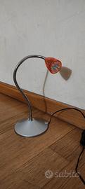 Lampada da tavolo con braccio flessibile e paralume in plastica arancione.
