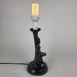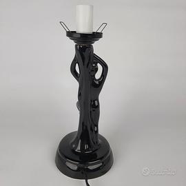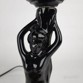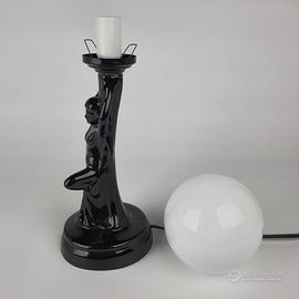 Beautiful vintage Art Deco style nude female figure table lamp in glossy black ceramic holding an opaline blown glass globe lampshade, made in France, late 1970s early 1980s.