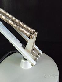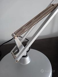 Iconica lampada da tavolo a luce diretta non dimmerabile. La base e corpo orientabile sono realizzati in metallo/alluminio verniciato, finitura grigio. L'accensione avviene tramite interruttore a rotazione posto sulla testa del diffusore.