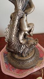 Lampada vintage da tavolo in antimonio raffigurante due putti con alla base un delfino. Sulla base della lampada vi é incisa la scritta Made Italy MM MOD RIS. Misure: Altezza Totale 47cm Diametro Base 17,6cm