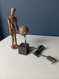 Lampada da tavolo con base cubica in materiale plastico nero, dalla quale parte