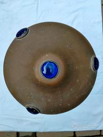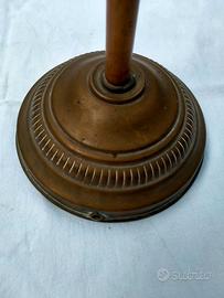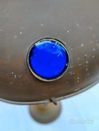 Magnifica e rara lampada da tavolo d'epoca in ottone, risalente ai primi decenni del '900. Un pezzo di illuminazione unico, ideale per collezionisti o per chi desidera un tocco di eleganza e storia nel proprio arredamento. Base e fusto in ottone, con una bellissima patina d'epoca che ne testimonia l'età. Paralume a campana impreziosito da cabochon in vetro blu che creano un effetto luminoso unico. L'oggetto presenta evidenti segni del tempo e ossidazione, che ne accentuano il fascino e l'autenticità. Tutti i cabochon in vetro sono presenti e intatti. La lampada è un pezzo da collezione che necessita di un restauro dell'impianto elettrico per diventare completamente funzionante.
