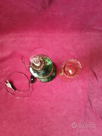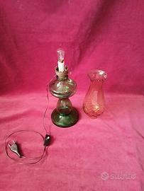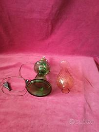 Funzionamento elettrico. Riproduce la forma delle antiche lampade a petrolio. Base in vetro soffiato verde smeraldo. Portalume ( camino) in vetro trasparente con lavorazione a rilievo effetto nido d'api. Cavo elettrico, interruttore, lampadina con attacco piccolo (E 14). Dimensioni: H cm 47, base diametro 13. Mai usata.