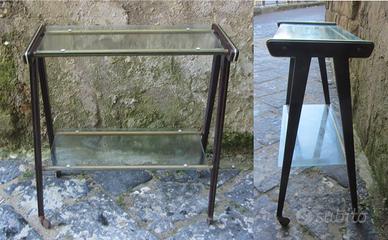 4) -- Antico tavolinetto portatelevisione, (Industrie Ramal - Torino) con due ripiani in vetro, misura cm. 85 d'altezza x cm. 82 di larghezza x cm. 37 di profondità, condizioni come da foto. Leggera ammaccatura all'interno di uno dei piedi