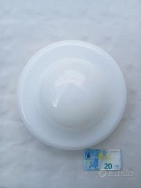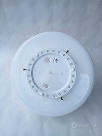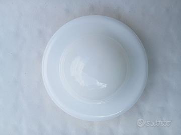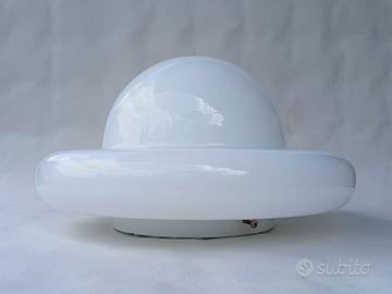 Originalissima e rara lampada da parete o soffitto in condizioni eccellenti, direttamente dagli anni 70 segue le linee morbide tipiche della space age. Il globo in vetro opalino sagomato nella forma di un UFO è fissato alla base metallica per mezzo di tre viti che rendono agevole il montaggio e lo smontaggio. Diametro 35cm, spessore totale 20cm.