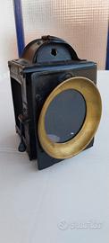 Bellissima lampada di segnalazione ferroviaria di origine francese in lamiera verniciata nera e ottone, si illumina tramite candela o lumino a olio non fornito