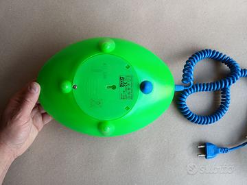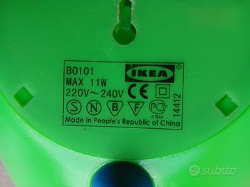 Rara lampada da tavolo (anche adattabile a parete) prodotta da Ikea negli anni 80, funzionante in condizioni molto buone decisamente vicine al nuovo. Colori verde e blu, design accattivante e pulsante di accensione ingegnosamente occultato nel piede blu della lampada. Dimensioni del corpo verde della lampada: 28x20 h11. Cavo lungo estensibile a molla e presa italiana. Modello Löv B0101.