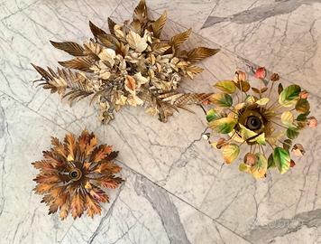 Lampada plafoniera o applique Hollywood Regency in ferro battuto Anni 60’. Ad 1 luce Diametro 45 cm Design: Struttura decorativa composta da foglie in ferro battuto dipinto sui toni naturali delle foglie e fiori disposti a raggiera. Funzione: Utilizzabile sia come lampada da soffitto (plafoniera) che da parete (applique). Disponibili anche le altre 2 lampade in foto