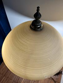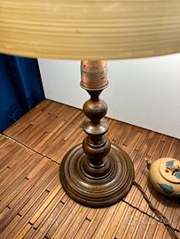 in legno tornito , con forme armoniose e una solida base circolare. Il paralume è in vetro color crema, con una delicata lavorazione a righe orizzontali, che diffonde una luce ( doppia come in foto)calda e accogliente.