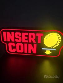 insert coin lampada led luce insegna luminosa gaming arcade retro sala giochi gamer game room arredo cameretta ragazzi decorazione neon light idea regalo stampa 3d artigianale quadro luminoso anni 80 90