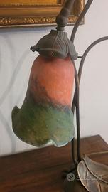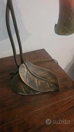 Lampada in stile Liberty (Art Nouveau), caratterizzata da forme che richiamano la natura. La lampada ha due steli flessuosi che sorreggono paralumi in vetro a forma di fiore e una base che ricorda una foglia di ninfea, misura 54 cm di altezza.