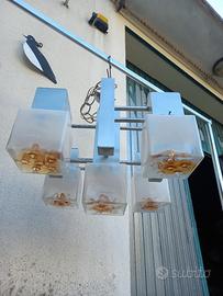 Lampada sospensione struttura in metallo diffusori in vetro di Murano Misura 44x44 h34 lunghezza catena sessanta funzionante integro.