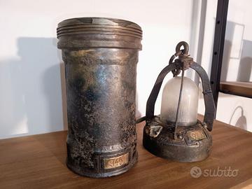 Lampada portatile corazzata pesante da miniera, 1930-40, ferro, ottone, vetro, batteria di alimentazione, altezza 36 cm , larghezza 12 cm ,profondità 12 cm, peso 8 kg.