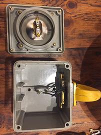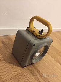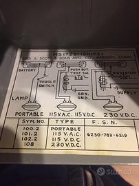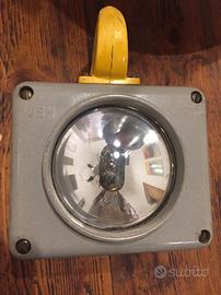 Vecchia lampada militare portatile ( no batteria) in uso forze armate americane , struttura corazzata in acciaio verniciato , con schema elettrico interno per collegare batteria ricaricabile , possibile risalente anni 50/60 euro 150 più spedizione