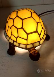 Lampada Tartaruga stile Tiffany - Vetro Opalescente e Metallo - Luce d'Atmosfera.Stile: Tiffany / Liberty Soggetto: Tartaruga Materiale Paralume: Vetro artistico legato a piombo/stagno Materiale Base: Metallo brunito (effetto bronzo/ottone) Colore prevalente: Giallo Ambra / Crema Tipo di lampadina: Attacco piccolo (E14) - Consigliata LED per non surriscaldare il vetro Questo complemento d'arredo non è solo una fonte di luce, ma una vera e propria scultura decorativa. Il guscio è realizzato artigianalmente con tasselli di vetro opalescente nei toni del giallo caldo, che una volta accesi creano un'atmosfera accogliente e rilassante in ogni stanza.