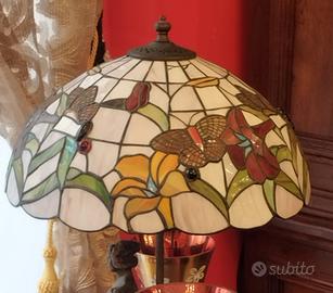 Incantevole lampada da tavolo in vetro piombato, sinonimo dello stile reso popolare da Louis Comfort Tiffany, caratterizzata da un grande paralume composto a mosaico da otre 200 vetri colorati che creano un meraviglioso effetto luminoso, caldo e diffuso. Assemblati manualmente con saldature a stagno.