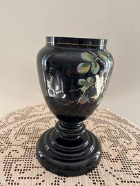 Lampada ad olio in opalino nero risalente alla fine dell’800. La lampada risulta danneggiata in quanto manca la base della boccia. Comunque può essere utilizzata senza, con la boccia appoggiata alla base o solo come vaso. La scritta “Ricordo” presuppone sia stata realizzata per un’occasione speciale.
