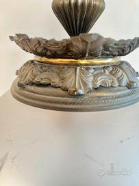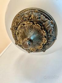 Lampadario a sospensione boccia in vetro soffiato di Murano inciso a mano degli anni 50 caratterizzato da una forma a globo in vetro satinato con decorazioni incise che creano un motivo a rombi e foglie stilizzate. La struttura sostiene il globo è in bronzo dorato, materiale pregiato ed elegante , con finiture lavorate che richiamano uno stile retrò. Questo elegante lampadario illuminava un salone veneziano del 1800 in Italia. Altezza 40cm, diametro 25cm, altezza con catena 60cm, peso 2,2kg. Funzionante ed in ottime condizioni con il bronzo che ha assunto una patina veramente unica e antica. Disponibili due pezzi uguali.