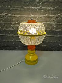 lampada anni 70 space age Vetreria VCM Reims France struttura in metallo laccato giallo e arancione paralume in cristallo molto spesso e pesante impianto elettrico funzionante, monta 2 lampadine E14 condizioni ottime Misure del prodotto Diametro paralume:20 cm base:12 cm Altezza:36 cm