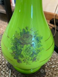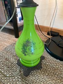 Lampada ad olio convervita per l’uso elettrico, caratterizzata da un corpo in vetro opalino color verde brillante con decorazioni floreali e base in metallo Elemento decorativo vintage Altezza lampada cm 55 Tubo cm 25 Consegna a mano in zons