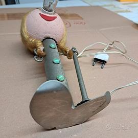 Lampada vintage figurativa per bambini – anni ’50/’60. Originale lampada da tavolo vintage anni ’50/’60 a forma di personaggio, ideale come luce decorativa o da collezione. Struttura in metallo verniciato, testa in polistirolo dipinto a mano con capelli in fibra e trecce originali. Design ingenuo e giocoso tipico del periodo mid‑century. Portalampada E14 integrato nel volto, interruttore in linea. Oggetto non firmato, probabilmente produzione artigianale europea (Italia/Germania). Affascinanti segni del tempo compatibili con l’età, completamente originale. Perfetta per arredamento vintage, cameretta, vetrina o collezione modernariato.