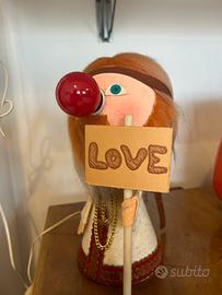 …..peace and love,fantastica lampada da tavolo anni 70 come nuova rappresentante un figlio dei fiori con tanto di catenina,fascetta,cartello love ed abbigliamento hippy,realizzata in polistirolo e tessuto con lampadina rossa…stupenda.
