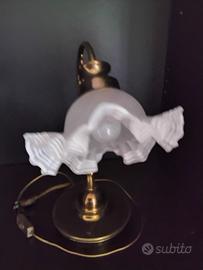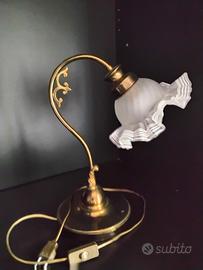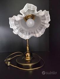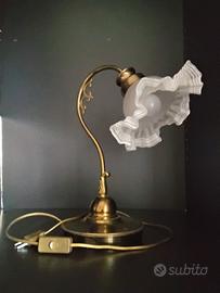 Llampada vintage da tavolo in ottone e corolla in vetro satinato funzionante.