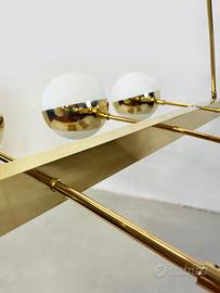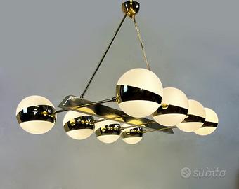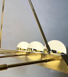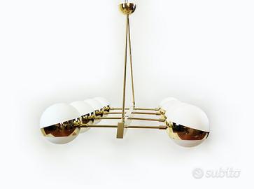 Elegante lampadario Vintage 1970 interamente realizzato in ottone con otto globi in vetro opalino bianco disposti simmetricamente. Dimensioni: L 130 x P 80 x H 80 Provenienza: Italia Epoca: 1970