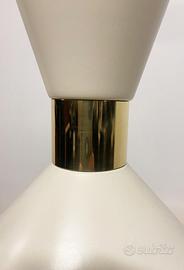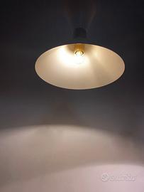 Particolare lampadario a sospensione Pagoda, realizzato in alluminio colorato bianco, con dettagli in ottone. Epoca: Vintage 1970 Dimensioni: Ø15/34x H35 (cono) H100 cm