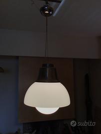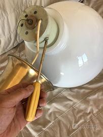 lampadario anni 50 formato da due calotte distinte in vetro opalino, la parte alta e in ottone con patina del tempo.....misura h. Fino a parte in ottone 40. Cm. Diametro vetro 35 cm. H.tot. 80 cm. Peso 3,8 kg. Si può accorciare...visto è piaciuto, non spedisco solo Ritiro a mano a Parabiago