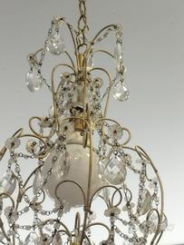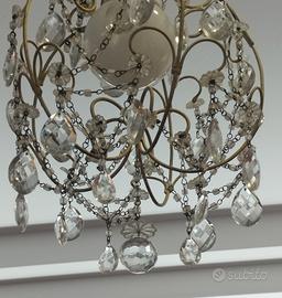 Elegante lampadario anni 50 con struttura in ottone e gocce in cristallo pendenti integre e complete.